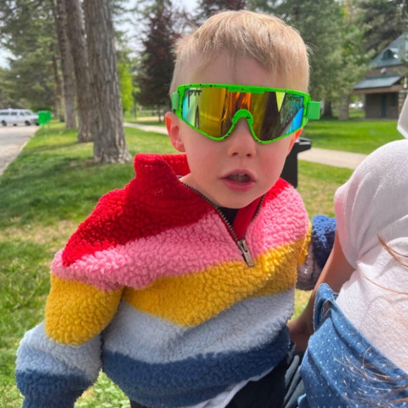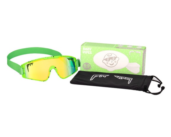 Pit Vipers for babies. The Baby Vipes feature the same UV protective lens as the originals but without the removable parts, eliminating swallow hazard. An adjustable elastic strap and miniature size makes these the perfect Pit Vipers for babies aged 6 9 months. Or older. Or younger.