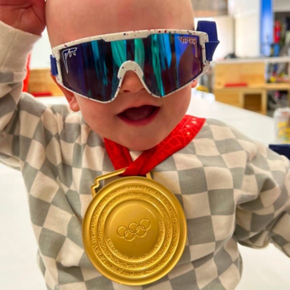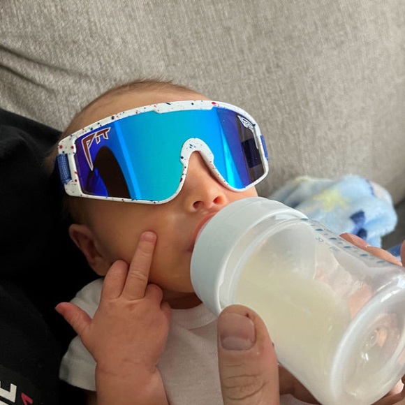 Pit Vipers for babies. The Baby Vipes feature the same UV protective lens as the originals but without the removable parts, eliminating swallow hazard. An adjustable elastic strap and miniature size makes these the perfect Pit Vipers for babies aged 6 9 months. Or older. Or younger.